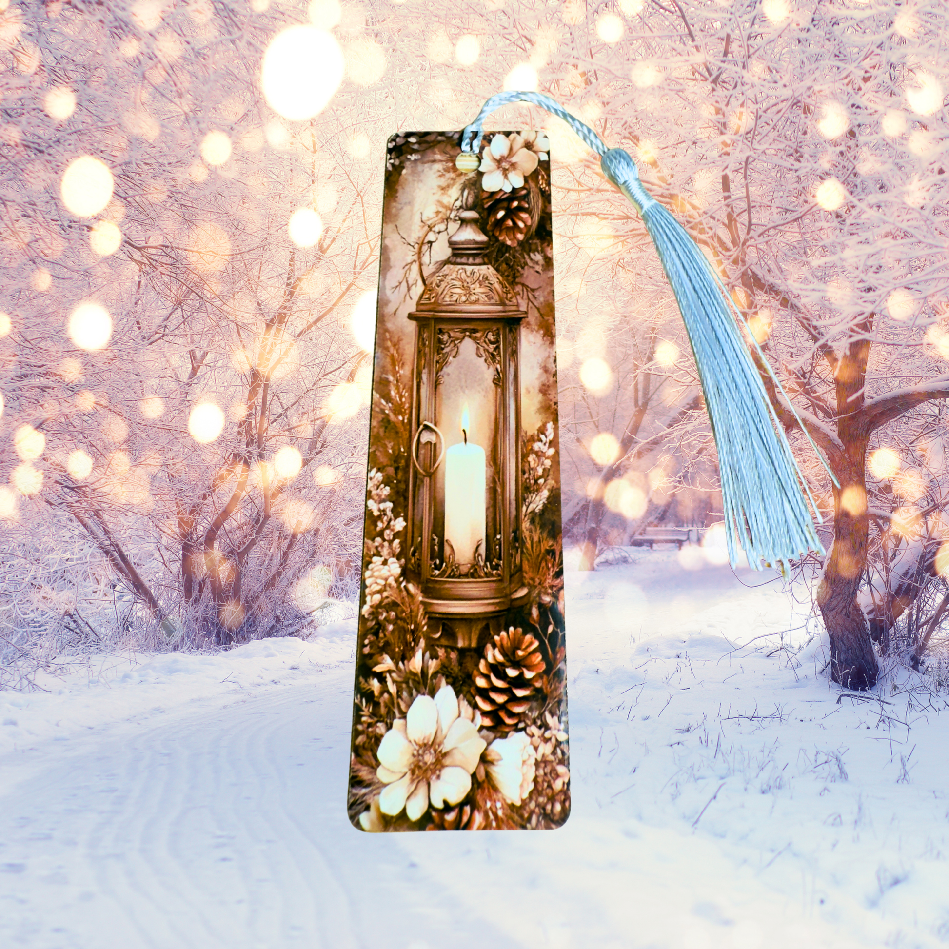 Ce marque-page en aluminium contient une magnifique lanterne, des bougies, déposer sur de magnifiques fleurs blanches et avec des pommes de pin. 🌲