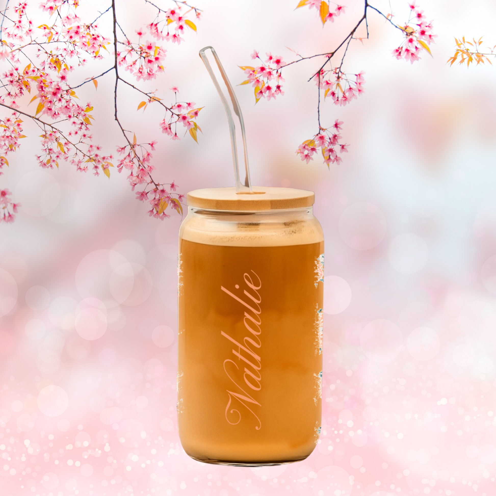 Égayer votre routine quotidienne avec ce verre à fleurs personnalisé. Les fleurs apporte joie et charme, tandis que le couvercle en bambou ajoute une touche naturelle. 🌿